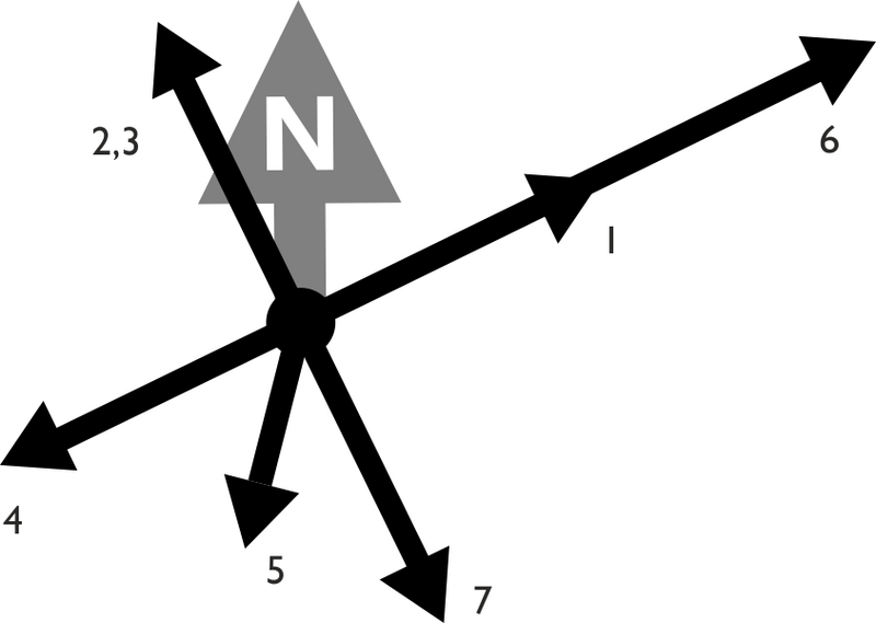 - Vaste noordpijl: Eén centrale noordpijl waaraan alle verschillende routestukken als zijtakken vastzitten.