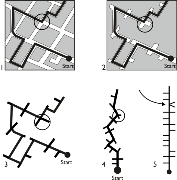 Als een doolhof gebruikt wordt als een routetechniek, is het doolhof nog het beste te vergelijken met de stripkaartroute. Je krijgt een plaatje van een doolhof te zien, waarbij slechts één route van de ingang naar de uitgang loopt. Dit is de route die je moet volgen. De zijwegen die je moet laten liggen, kun je in het doolhof terugvinden.