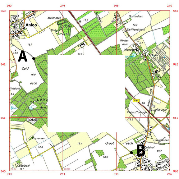 De oleaatroute is een doorzichtig vel met een getekende route die je over een stafkaart legt. Om de route op de juiste plek te krijgen, gebruik je de richtkruizen op het vel: deze leg je precies op de kruispunten van de blauwe roosterlijnen op de kaart. Zodra ze overlappen, zie je precies over welke wegen en paden de route loopt.